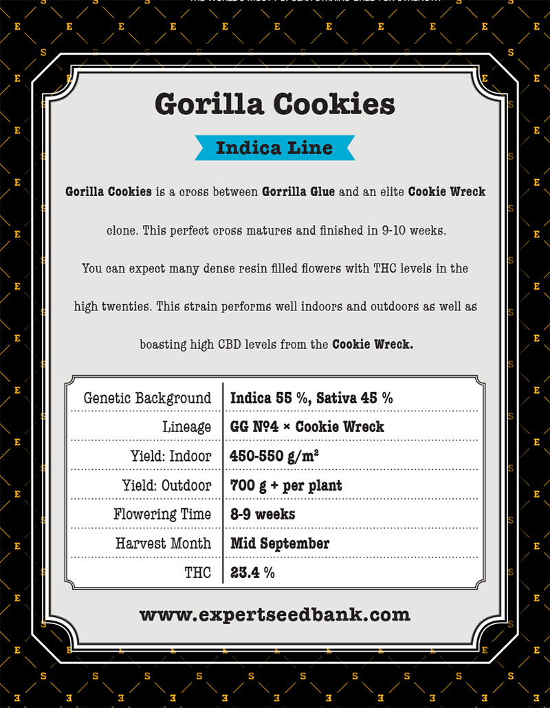 Gorilla Cookies Expert Seeds was created by crossing hemp King Kong (Gorilla Glue #4) with a clone of the elite Cookie Wreck variety. The result is a high quality hybrid that is suitable for even the most demanding cannabis connoisseurs.