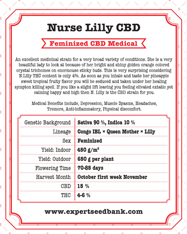 Nurse Lilly CBD (Nurse Lilly) from Seed Banks Expert Seeds is an excellent medicine with an amazingly delicious taste. It is well suited for the treatment of a wide range of diseases and health problems due to its extremely high CBD content. Cannabidiol CBD is a medicinal substance found in hemp plants that has been shown in clinical trials to have neuroprotective effects and anti-cancer potential.