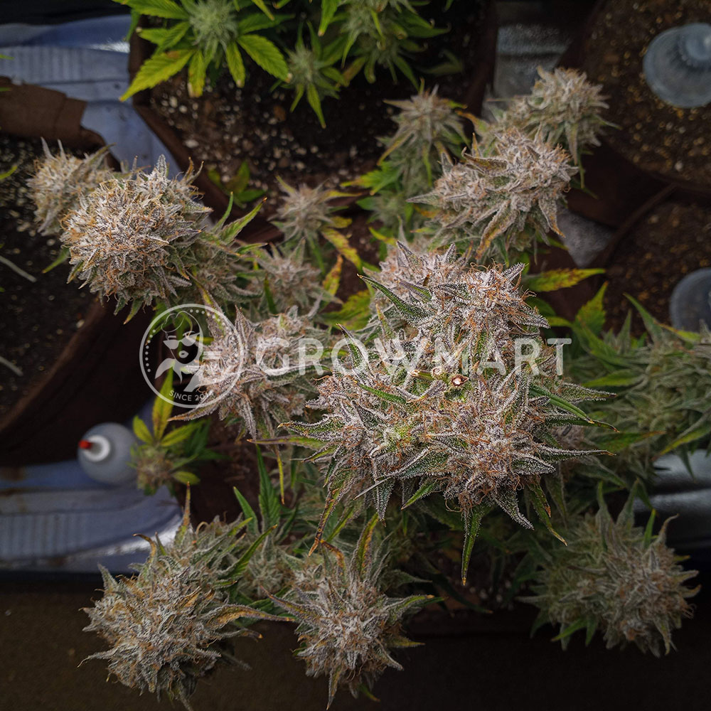 This lady grows sturdy and vigorous, reaching a height of around 150 cm. It has a compact but robust appearance with wide internodal spacing. It forms a dense main column with thick side branches all round, and requires little maintenance. It can produce up to 650 g/m2 in about 10 weeks. This makes it one of the most profitable varieties ever developed. Throughout the flowering period you will be amazed at the insane production of trichomes. Especially in the last few weeks, when it definitely puts on weight and you’ll see the buds turn white in resin and smell like biscuits and gas.
