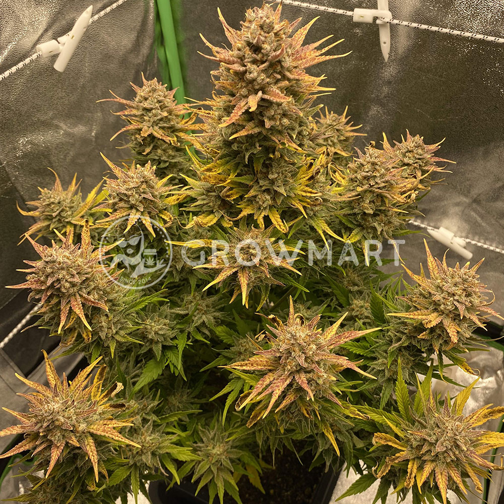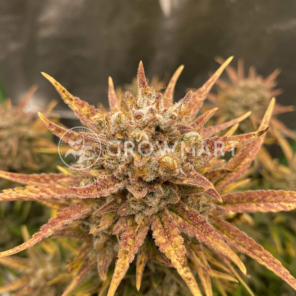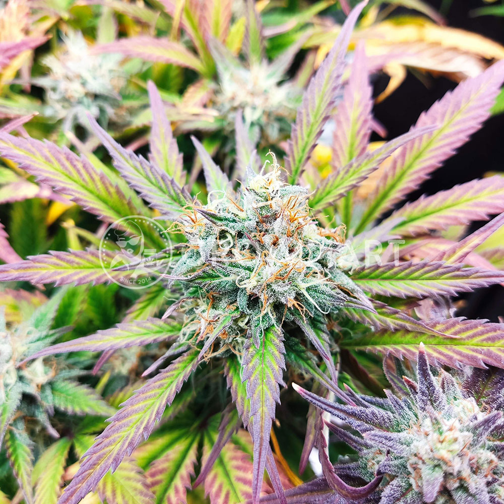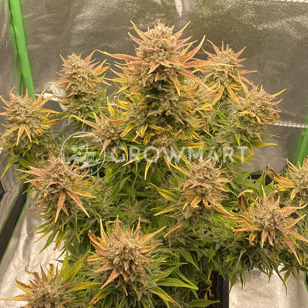 A fast flowering, balanced hybrid cultivar that is highly productive and requires only about 9 weeks from seed to harvest. Its rich THC and terpene content and medium height make it ideal for first-time growers. Especially for those with shorter summers. This strain is potent and tested at 24% with very impressive trichome production. A solid hybrid with strong cold weather resistance and excellent performance indoors and out. Expect phenomenal flavors that are a combination of vanilla dough, earthy and creamy, all along with sweet aromatic undertones of baked fruitcake.